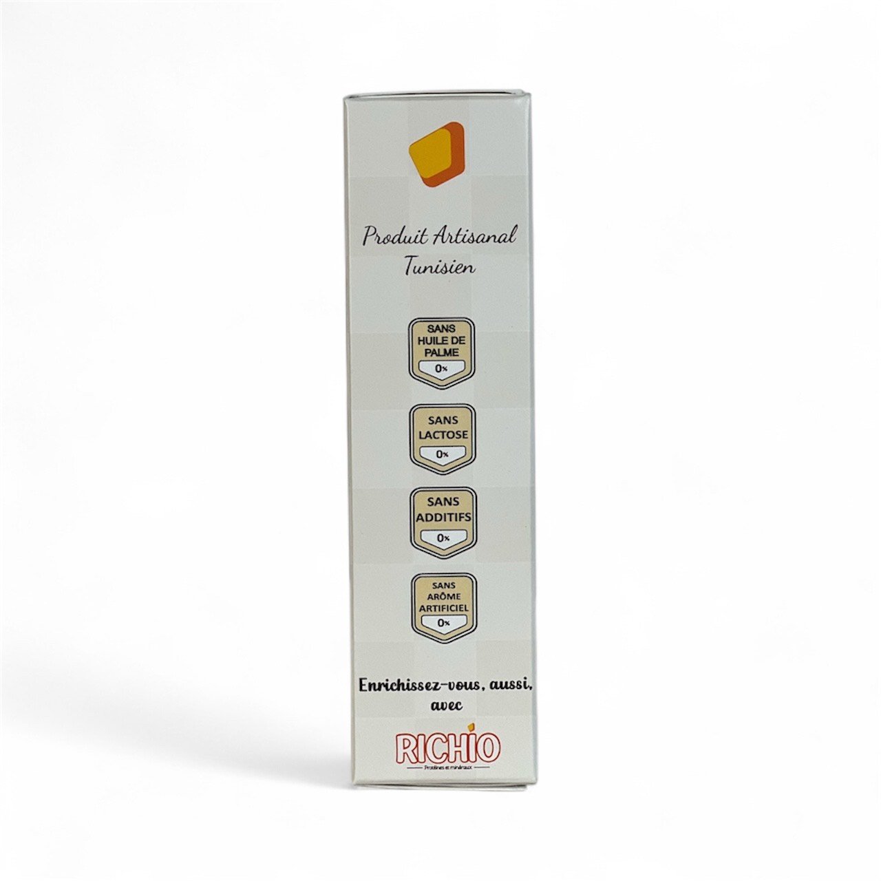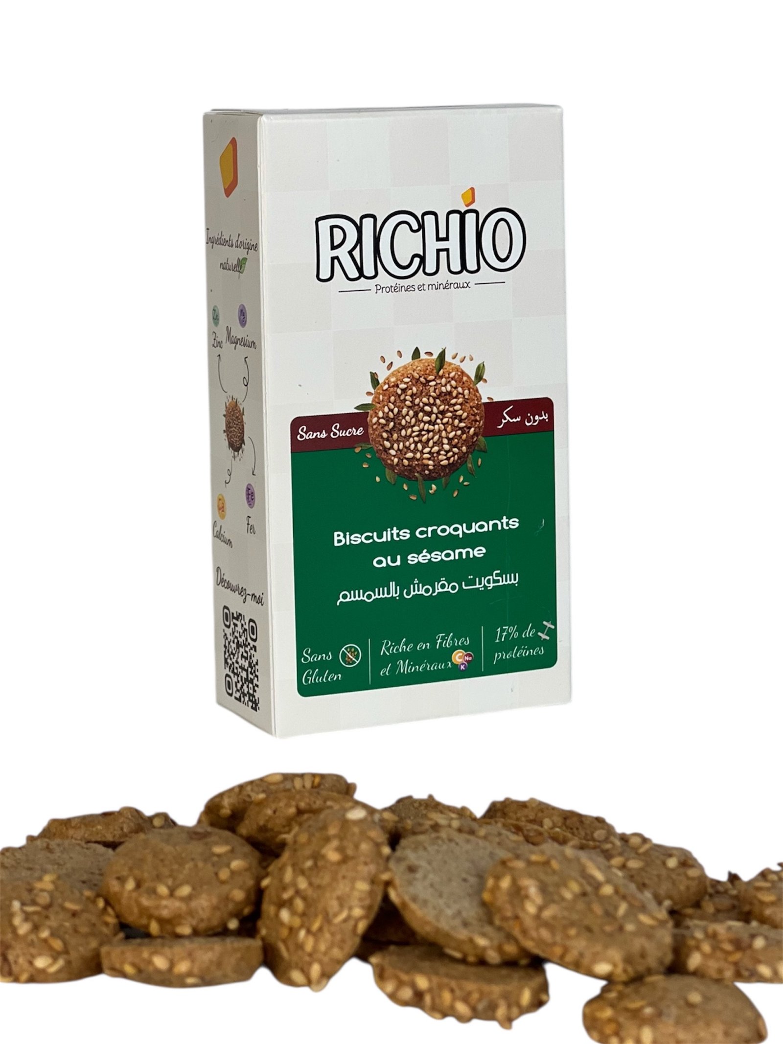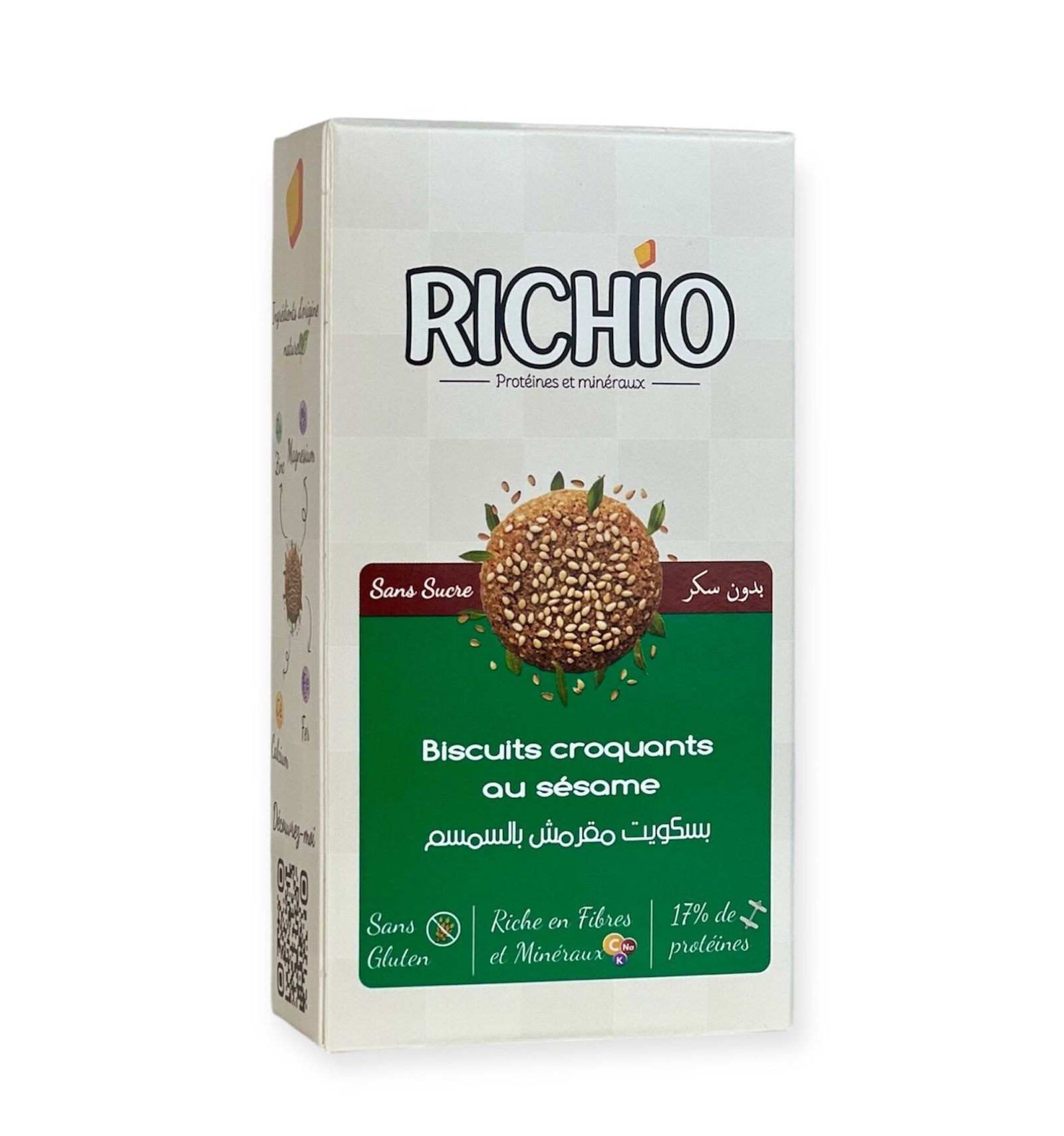Découvrez RICHIO Nature Sans Sucre, la version saine et équilibrée de notre biscuit emblématique. Élaboré sans gluten et sans sucre ajouté, il est conçu à partir d’ingrédients d’origine naturelle, soigneusement sélectionnés pour leur richesse nutritionnelle. Source de protéines, de fibres, de calcium, de magnésium et de zinc, ce biscuit croustillant met à l’honneur le goût pur du sésame. Sans conservateurs, sans huile de palme ni margarine, il accompagne vos pauses bien-être tout en respectant votre mode de vie. Un plaisir simple, pensé pour votre équilibre au quotidien.