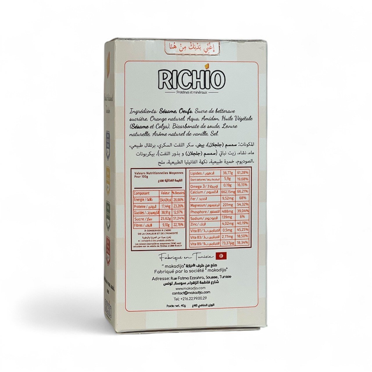 Ingrédients: Sésame, Sel, Sucre de la betterave sucrière, Amidon, Aqua, Bicarbonate de soude, Huile Végétale(Sésame et Colza), Oeufs, Levure naturelle, Arôme Naturel de Vanille, Orange Naturel.
